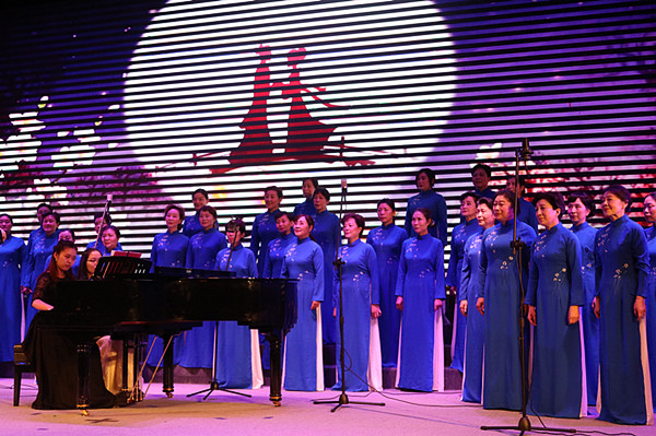 快乐朋友女子合唱团进行曲目表演 当天,湖北省慈善总会快乐朋友女子合唱团、湖北省第二师范学院漫笛合唱团、湖北省老年大学踢踏舞艺术团志愿者先后表演了《我的祖国》、《卷珠帘》、《大鱼》等16个节目,歌声和舞蹈带给观众一场文化盛宴。